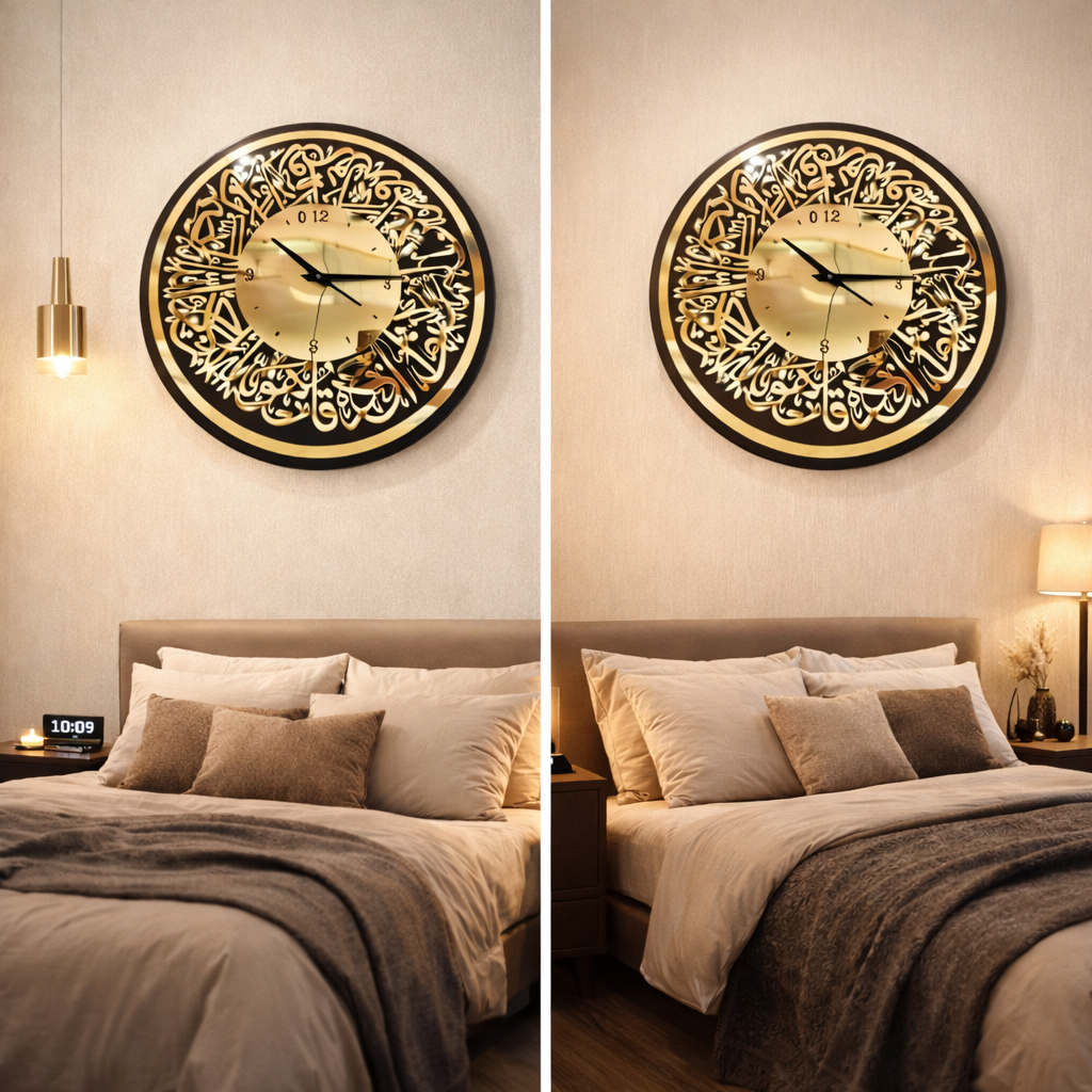 Designed for modern homes, this wall clock blends traditional Islamic calligraphy with a contemporary mirror-style finish, creating a calm yet powerful visual impact.